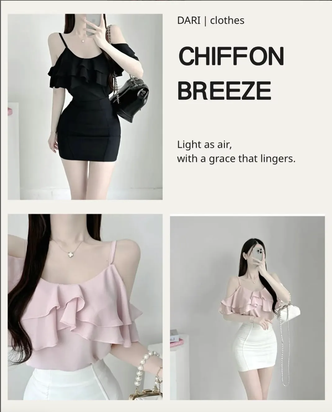 蜜桃色是心動的溫度。輕柔荷葉層層堆疊在肩線,修飾手臂也放大女人味,細肩帶加上小露鎖骨,溫柔得剛剛好❤️