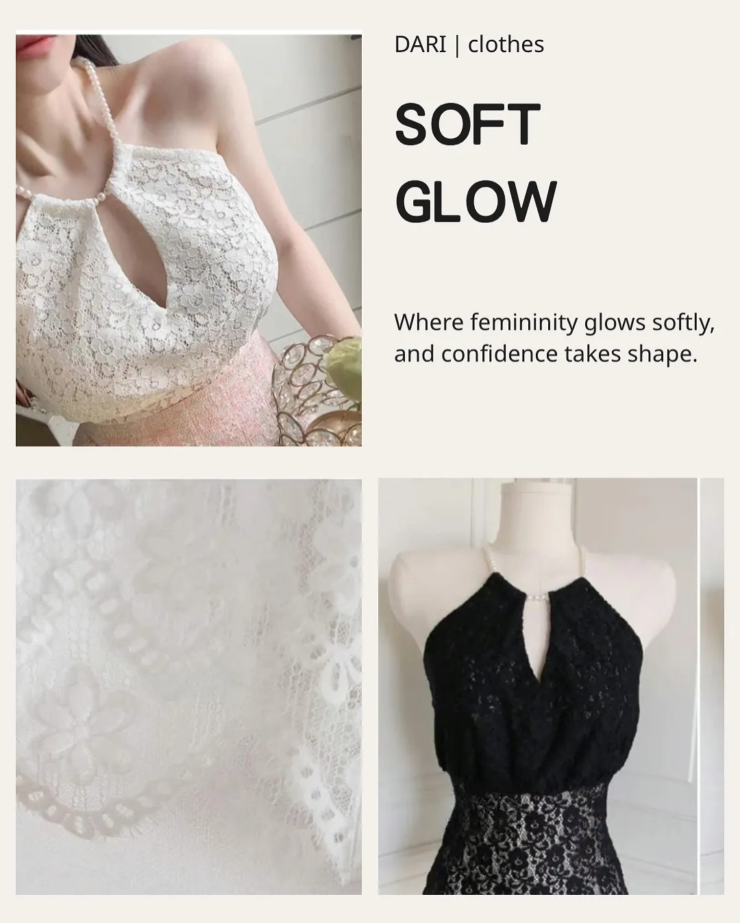 高彈蕾絲修飾腰線,挖胸剪裁襯托鎖骨線條,後背隱形拉鍊設計。珍珠頸鍊造型自帶飾品感,穿搭零負擔。