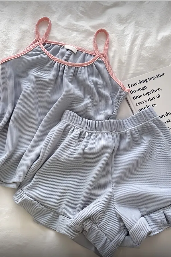 柔軟壓紋面料輕盈透氣,貼身穿著也不黏膩。細肩帶小可愛搭配荷葉短褲,