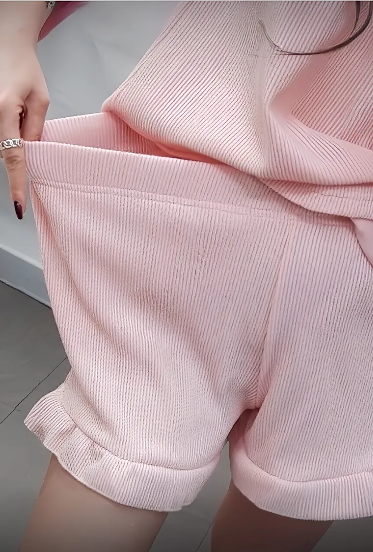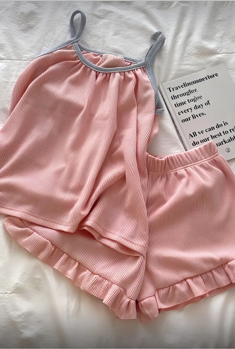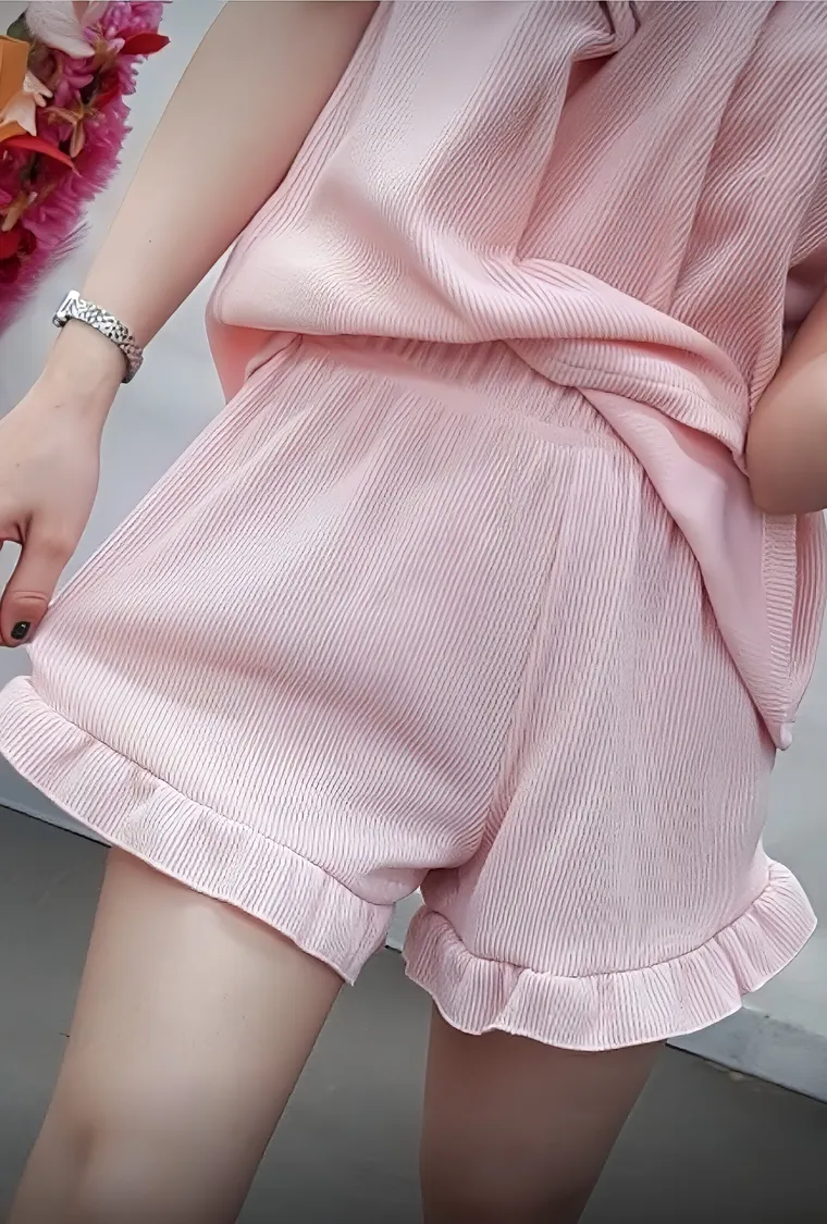 柔軟壓紋面料輕盈透氣,貼身穿著也不黏膩。細肩帶小可愛搭配荷葉短褲,