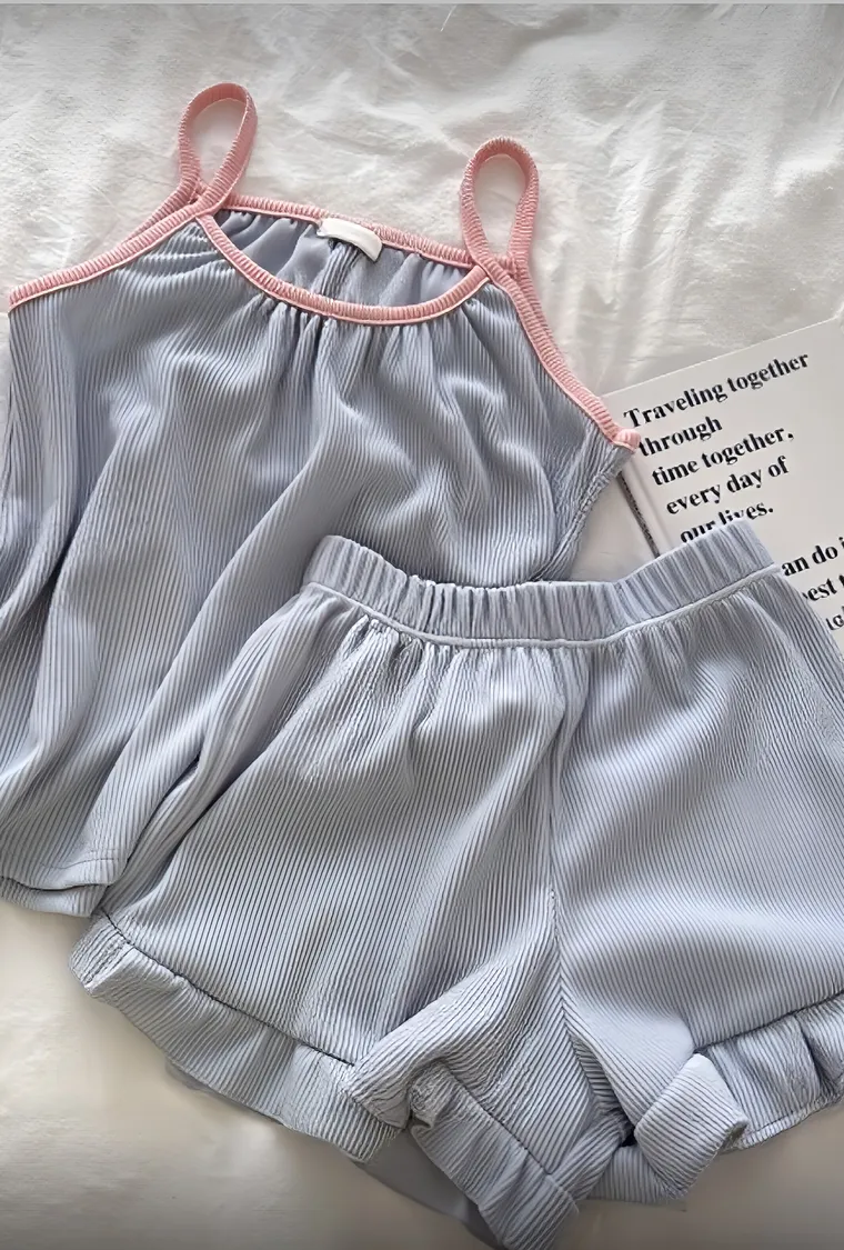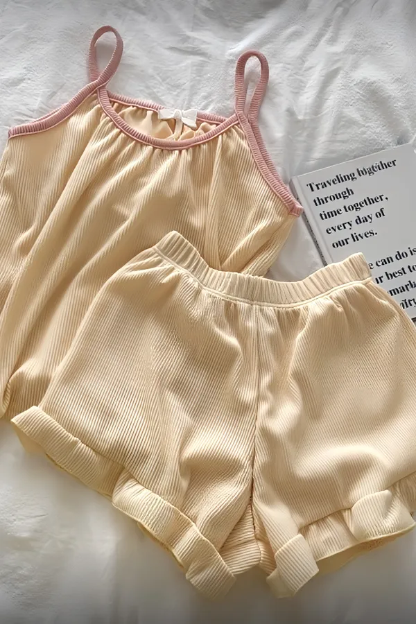 柔軟壓紋面料輕盈透氣,貼身穿著也不黏膩。細肩帶小可愛搭配荷葉短褲,